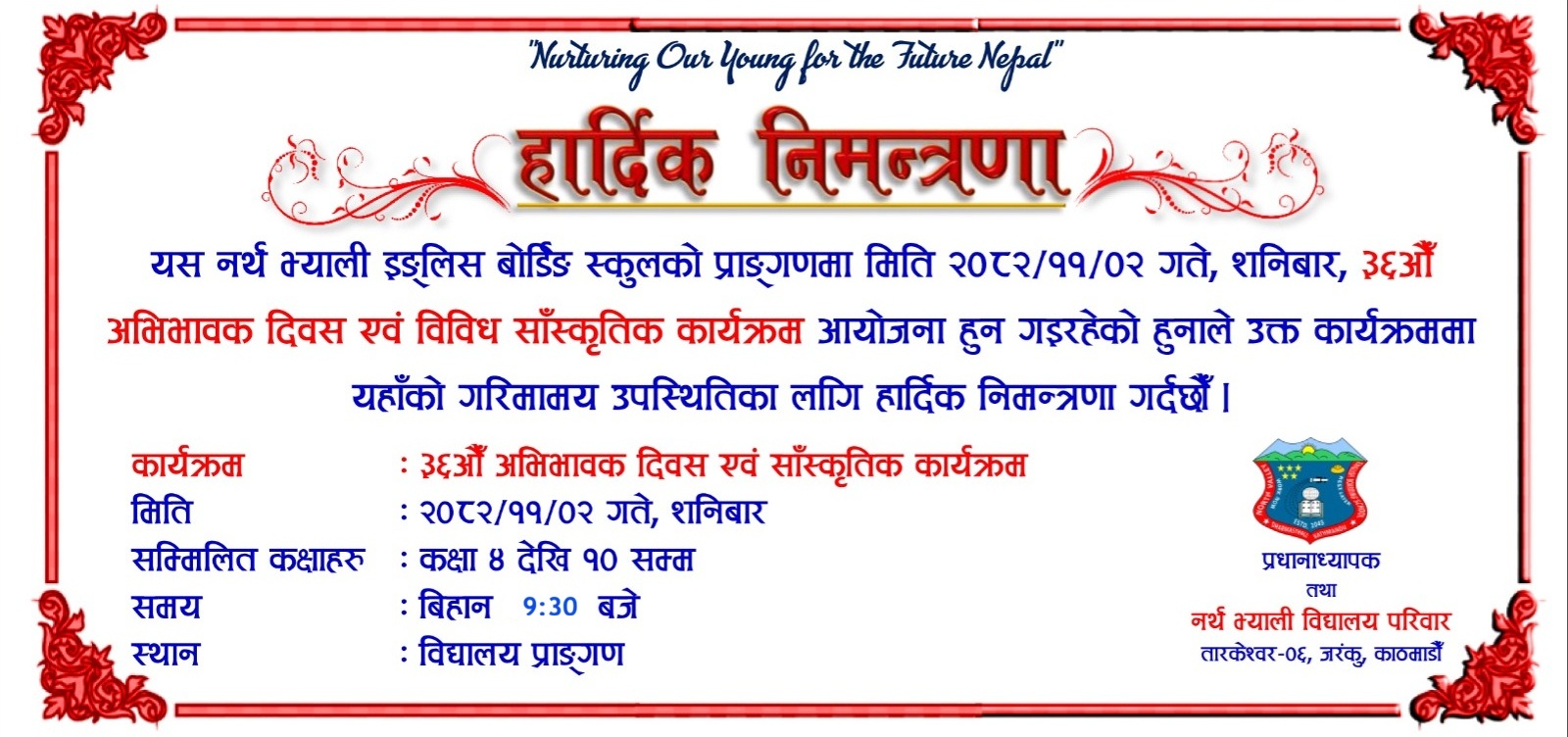 यस विद्यालयले मिति २०८२, फागुन २ गते शनिवार सिनियर स्कुलको ३६ औं अभिभावक दिवस भब्य रुपले मनाउन गइरहेको हुनाले सम्बन्धित सम्पूर्ण अभिभावकहरुलाई कार्यक्रममा अनिवार्य उपस्थित भइ हाम्रा विद्यार्थीहरुको हौसला बढाई दिन हुन हार्दिक अनुरोध गर्दछौं ।